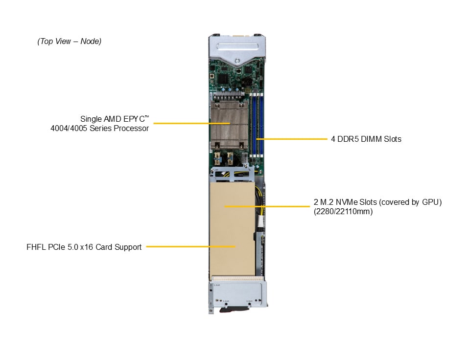 Wesentliche Merkmale 1. Bis zu 80 Server und 8 Ethernet-Switches pro 48U-Rack2. Bis zu 170W CPU mit Luftkühlung3. Unterstützt bis zu einer PCIe 5.0 x16 doppelt breiten FHFL-GPU oder Netzwerkkarte4. Bis zu 4 NVMe-SSDs5. Dual-Port 10GbE NIC auf dem Motherboard enthalten6. Kein Kabel zwischen jedem Server und zwei integrierten Ethernet-Switches
