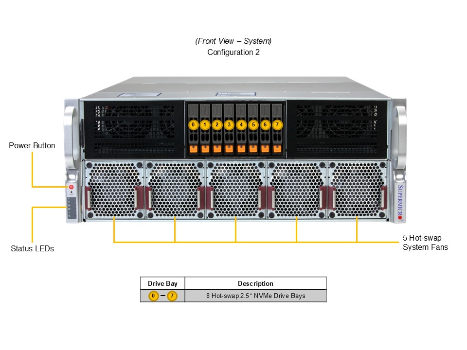 • 8 front hot-swap 2.5" PCIe 5.0 x4 NVMe drive bays