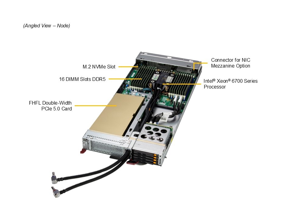 Key Features 1. 70 servers per 42U rack2. Single Socket E2 (LGA-4710), Intel® Xeon® 6 processors3. Supports 16x DDR5 ECC RDIMM/RDIMM 3DS (up to 6400MT/s 1DPC)4. 4 Hot-swap E3.S SSD (PCIe Gen5)5. Dual-port 25G Ethernet (LOM)6. Expansion slot for Ethenret mezzanine card and for standard PCIe card7. High density 6U Blade system with Integrated liquid cooling