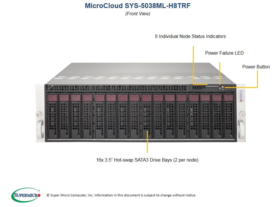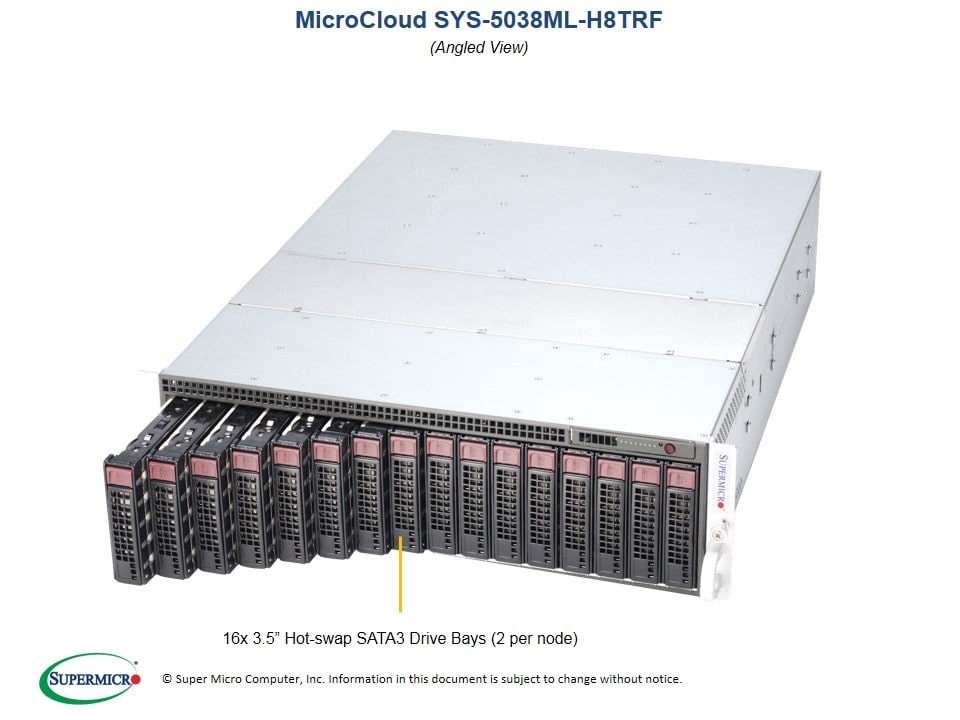 - 2x 3.5" hot-swap SATA3 (6Gbps) HDDs per node; up to 16 HDDs total