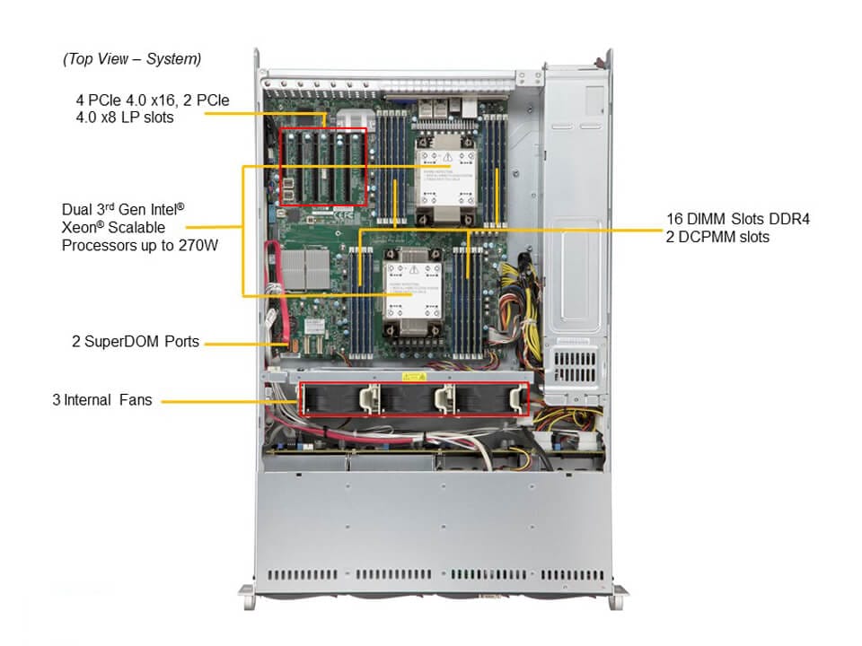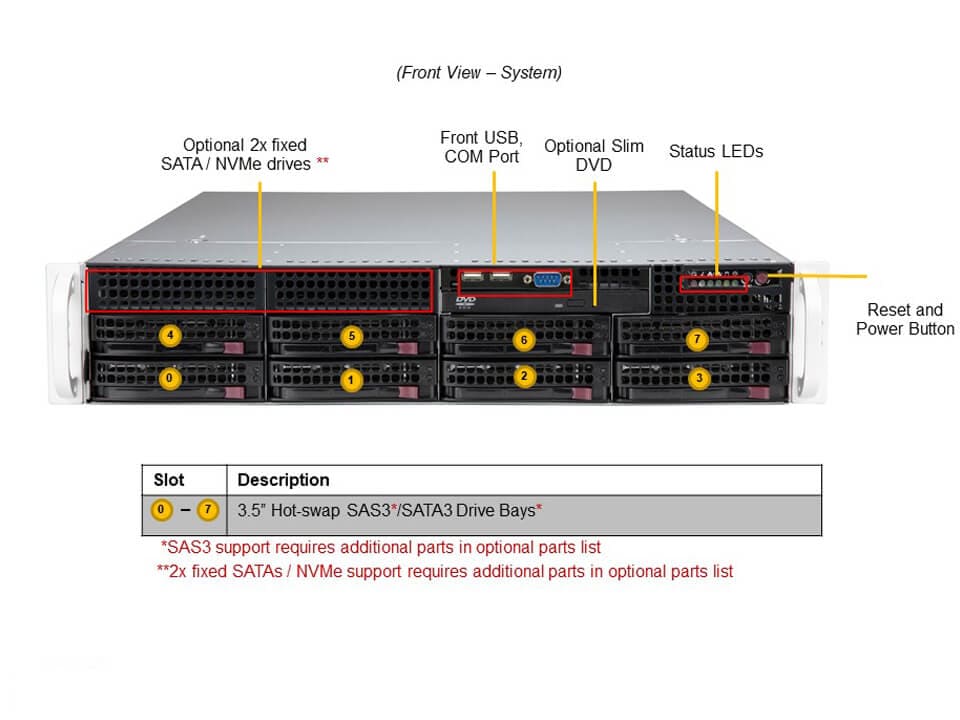 | Optional parts needed to support 2x fixed NVMe drives | 1x CBL-SAST-0953 (Slimline x8 to PCIe 2x SFF-8639 Power) and 2x MCP-110-82501-0N | 1 | 1x MCP-110-82501-0N can support 1x 2.5 inch NVMe fixed drives and 1x CBL-SAST-0953 can support 2x 2.5 inch NMVe drives |