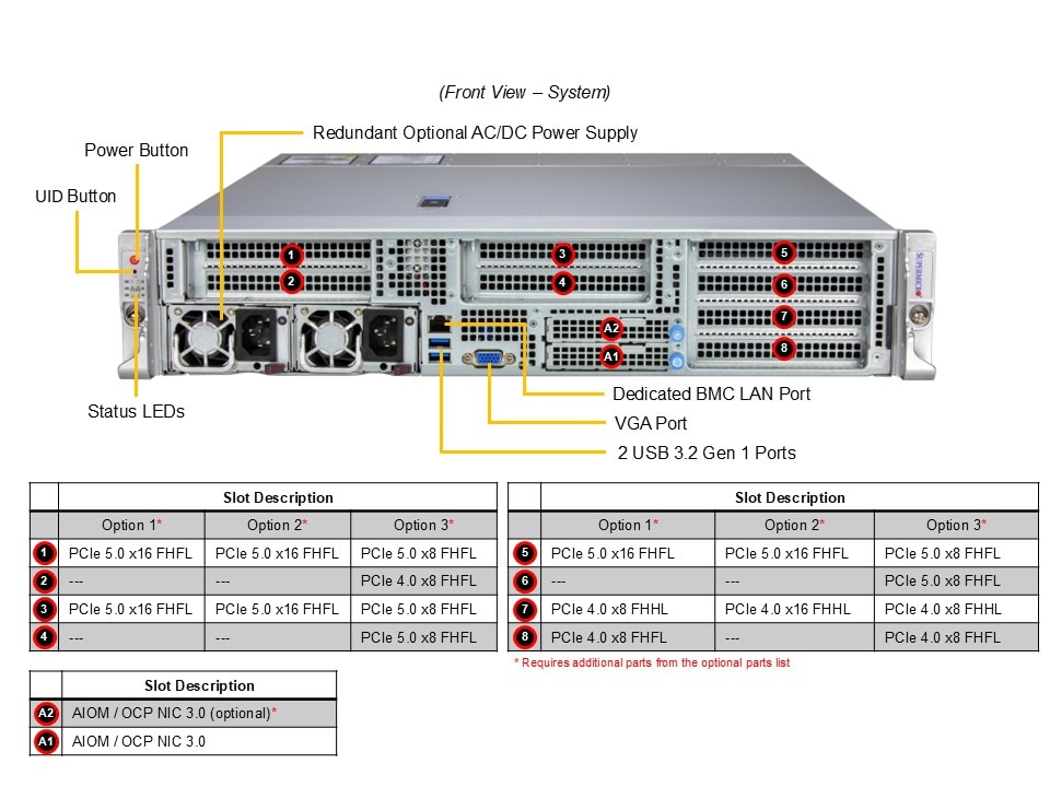 • (*Requires additional parts, please see the optional parts list for details. For more details on PCIe slot configuration options, please refer to the system callout images above.)