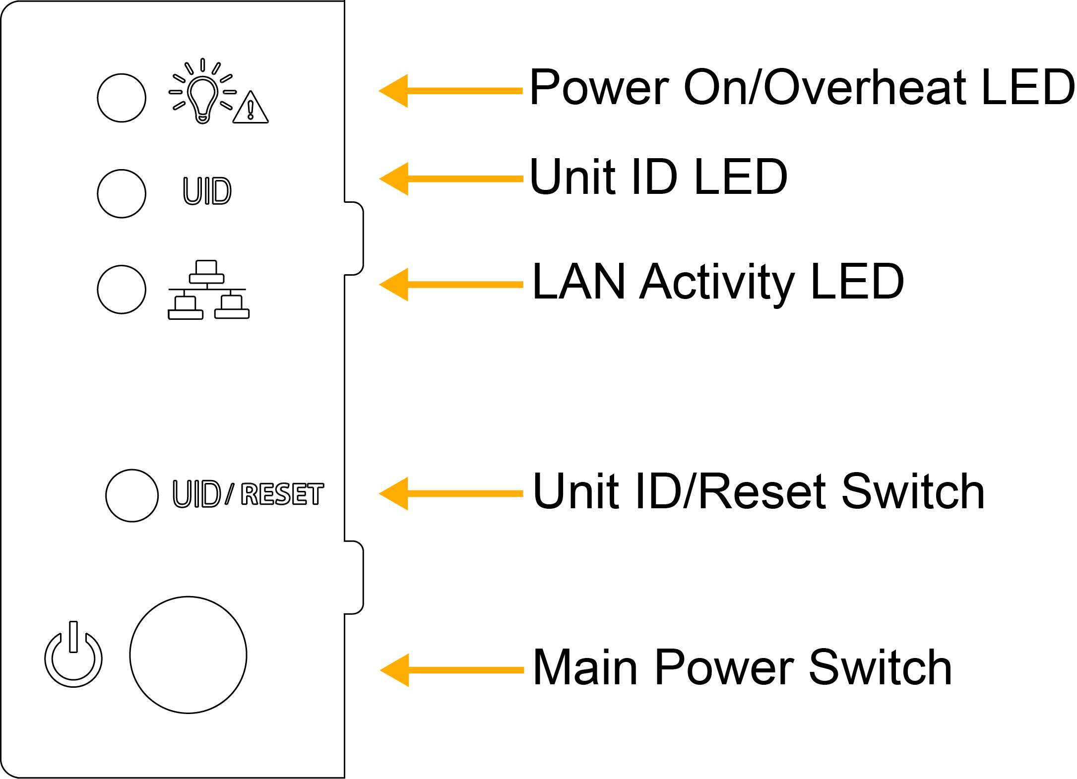 This button, when pushed momentarily, turns on the Unit ID LED. If pushed and held down for 3 seconds, it will perform a hard reset on the system. All information not saved will be lost. |