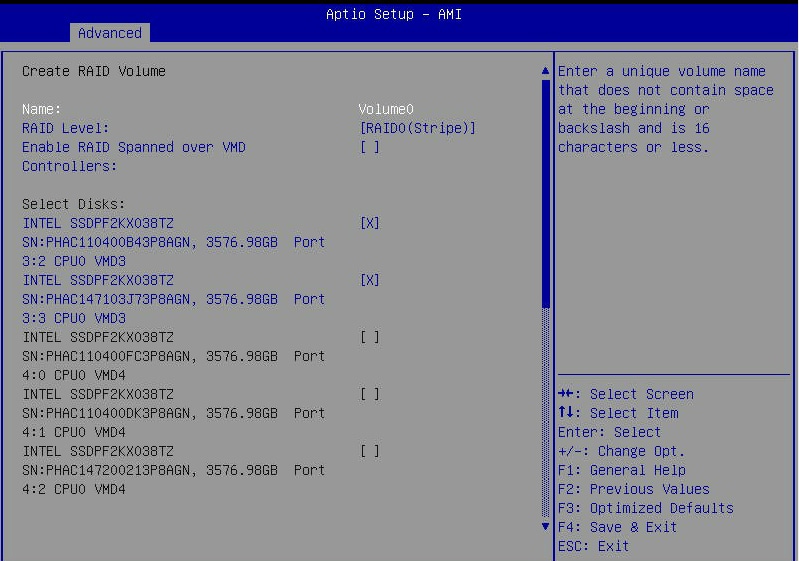Open Advanced > Intel(R) Virtual RAID on CPU > All Intel VMD Controllers > Create RAID Volume.