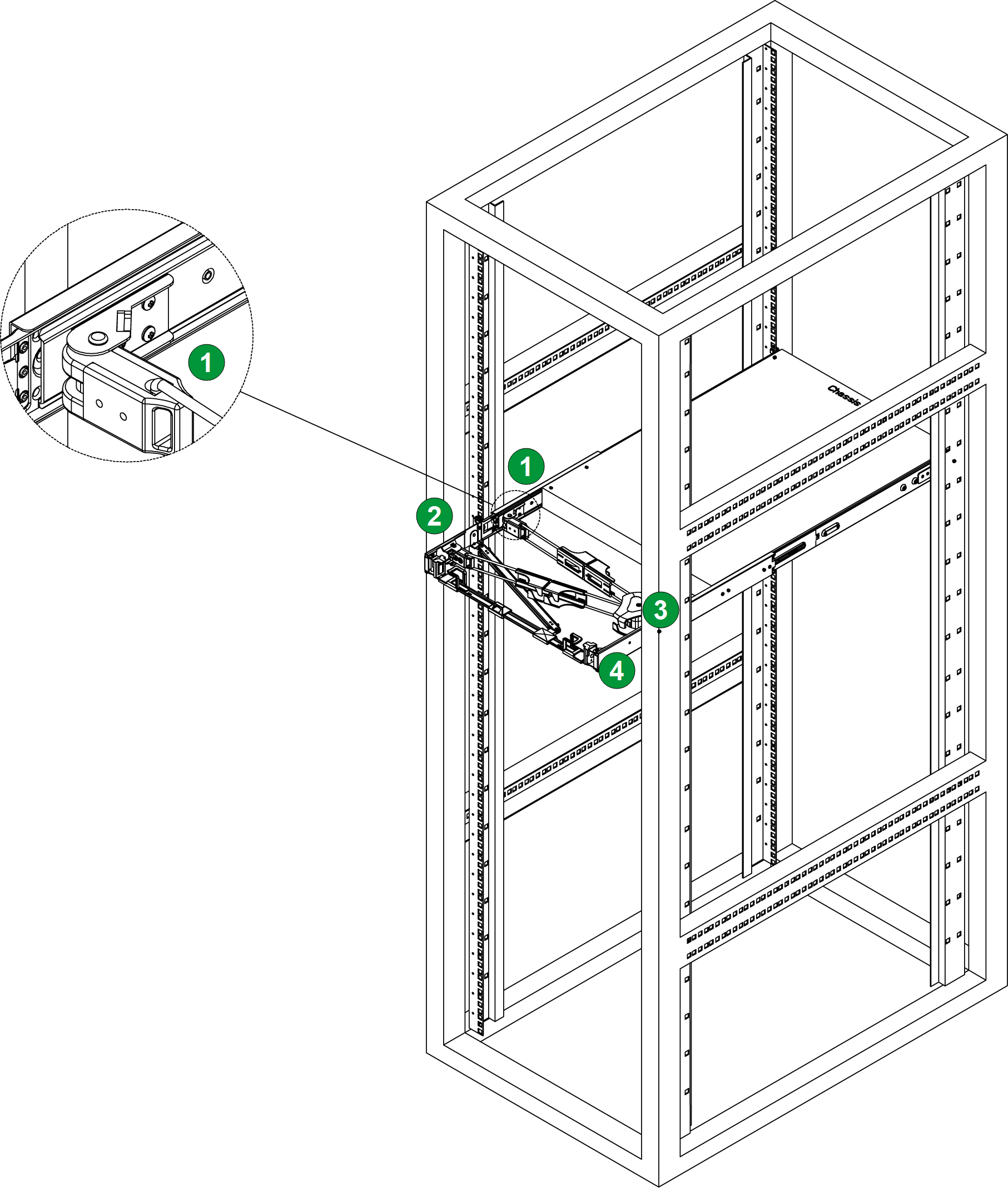 The CMA attaches to the rack mounting rails using four connectors. They are labeled as connectors 1, 2, 3, and 4.