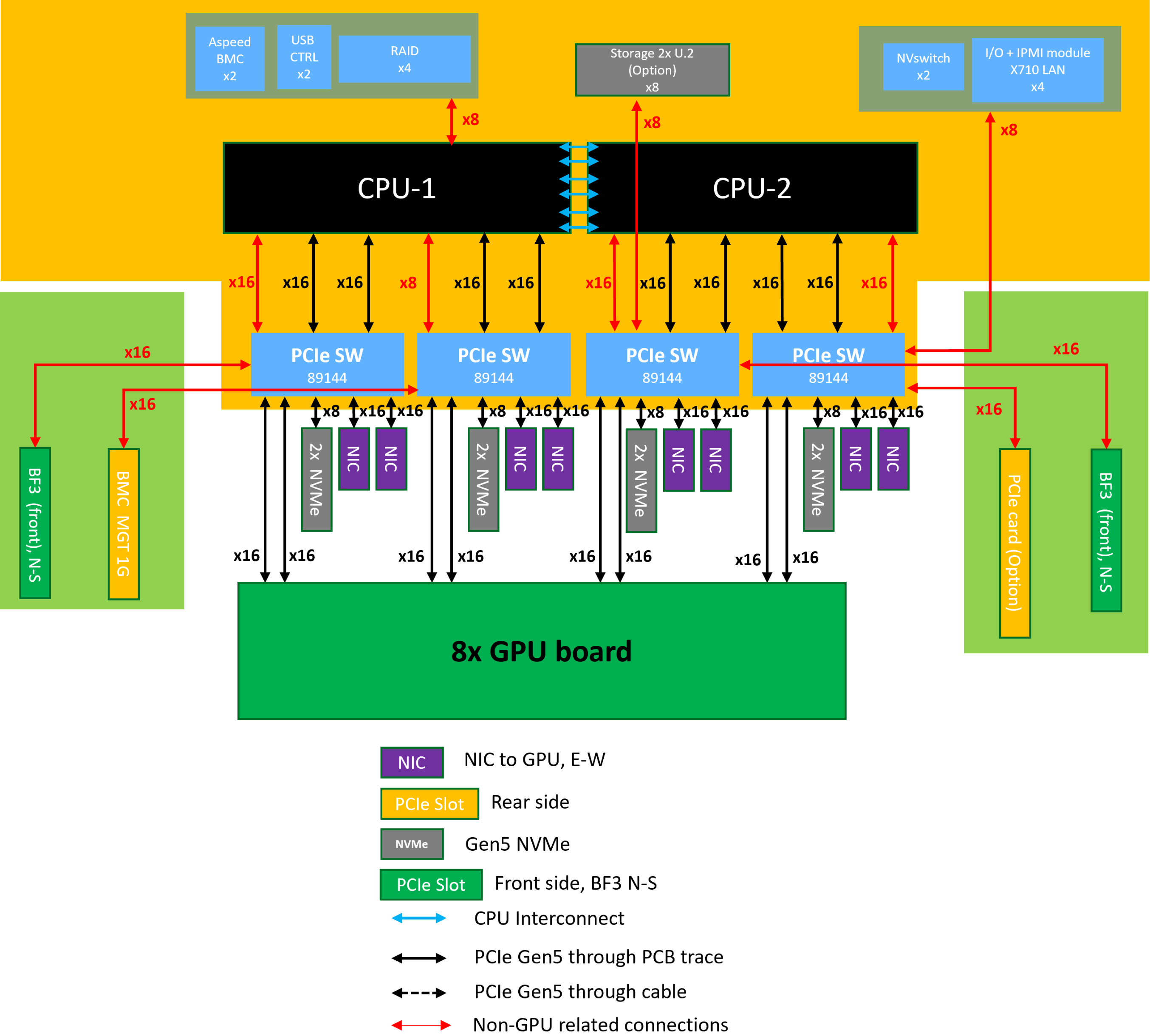 The following block diagram displays the connections and relationships between the subsystems and major components of the SYS-A22GA-NBRT server.
