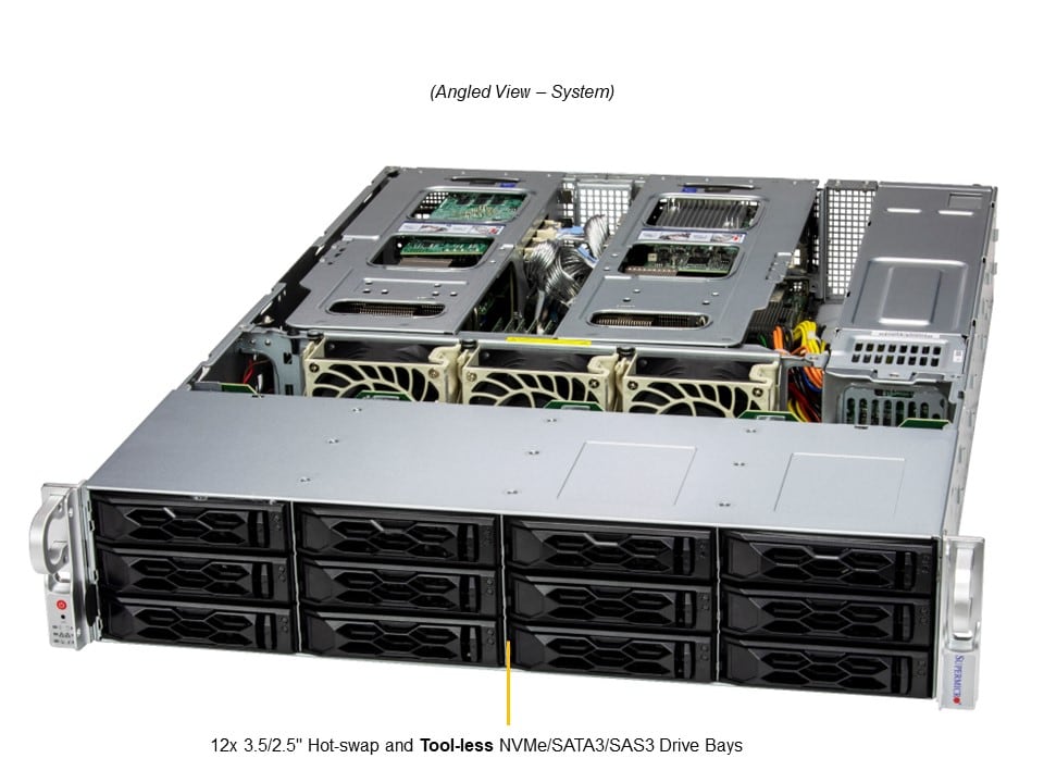2U DP CloudDC with 12 hot-swap 3.5" NVMe/SAS/SATA bays and 4 PCIe 5.0 x16 slots + 2 PCIe 5.0 x16 AIOM slots