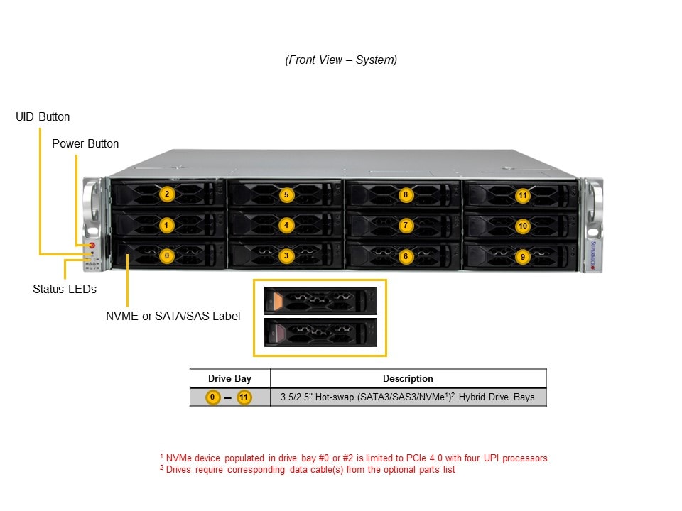 • 12 front hot-swap 3.5" NVMe*/SAS*/SATA* drive bays