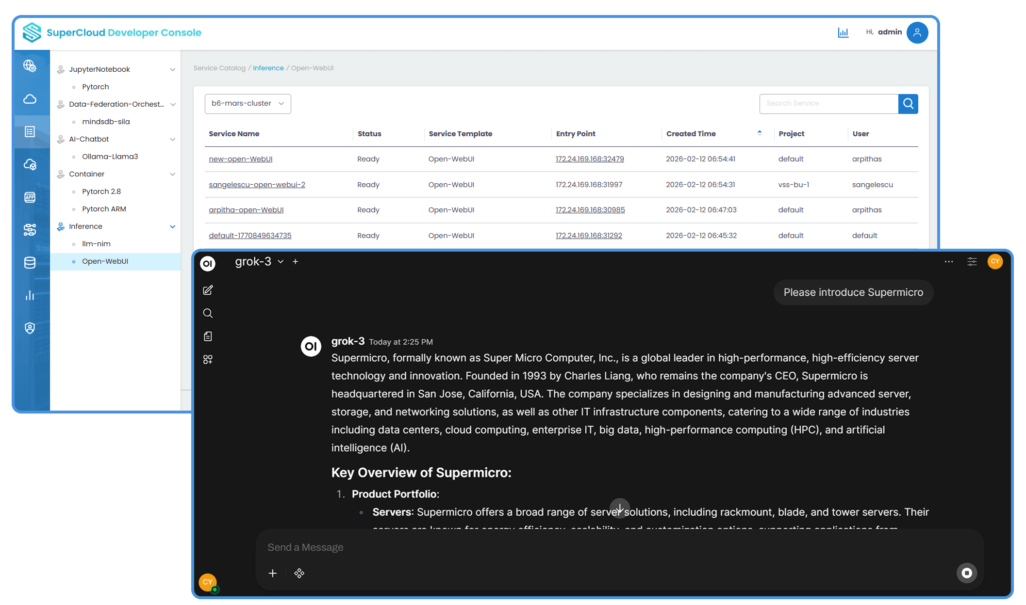 SuperCloud Developer Console SDX) es una plataforma de ejecución y aceleración de cargas de trabajo de IA que permite compartir de forma eficiente las GPU en entornos multitenant, proporcionando un entorno de desarrollo unificado, seguro y escalable que reduce el tiempo de configuración, maximiza el retorno de la inversión en GPU y acelera la entrega de modelos tanto en implementaciones empresariales como a hiperescala.