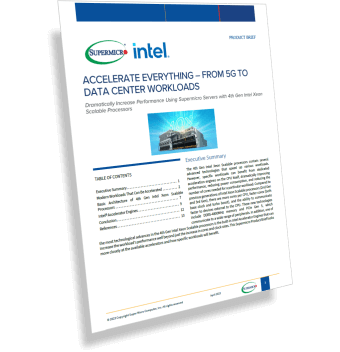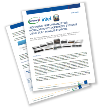 Bénéficiez de performances accrues et d'une plus grande efficacité pour un large éventail de charges de travail courantes grâce aux systèmes Supermicro équipés de processeurs Intel®Xeon® de 5e génération et Intel Xeon Scalable de 4e génération. Grâce aux moteurs d'accélération Intel intégrés directement dans le processeur, une plus grande partie du traitement peut être déchargée vers des accélérateurs dédiés et spécifiques à certaines tâches, libérant ainsi des cycles CPU pour le calcul des charges de travail réelles et augmentant les performances.
