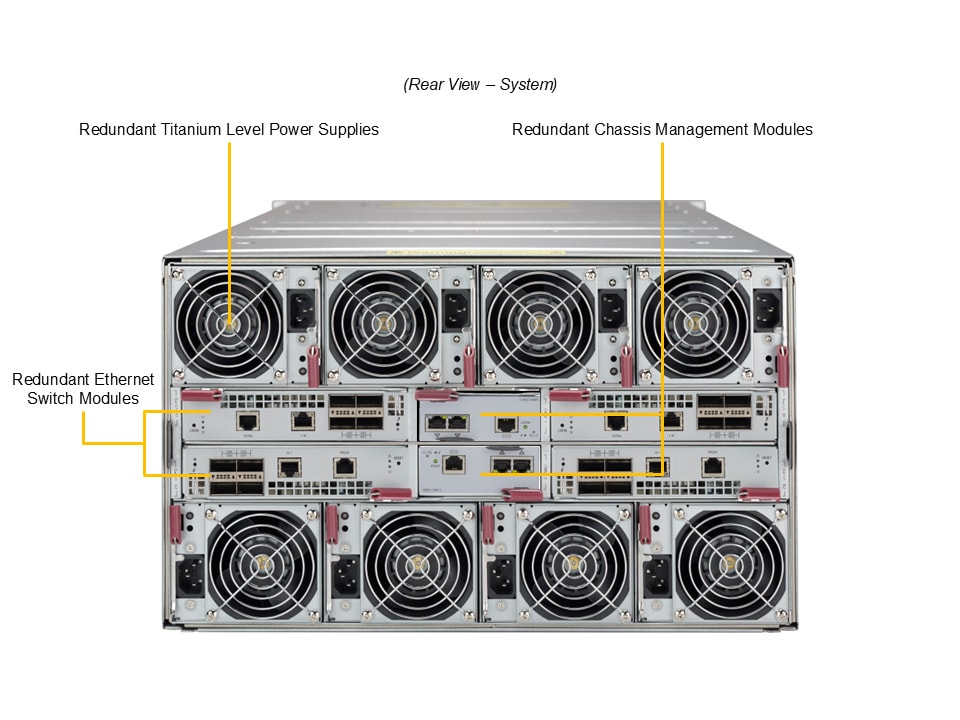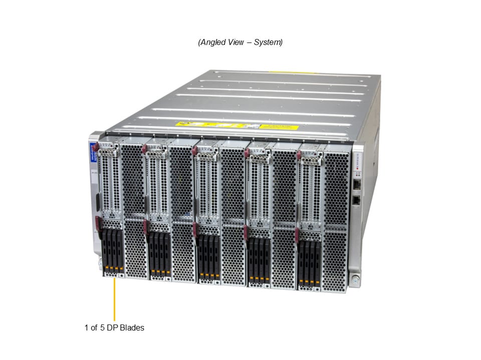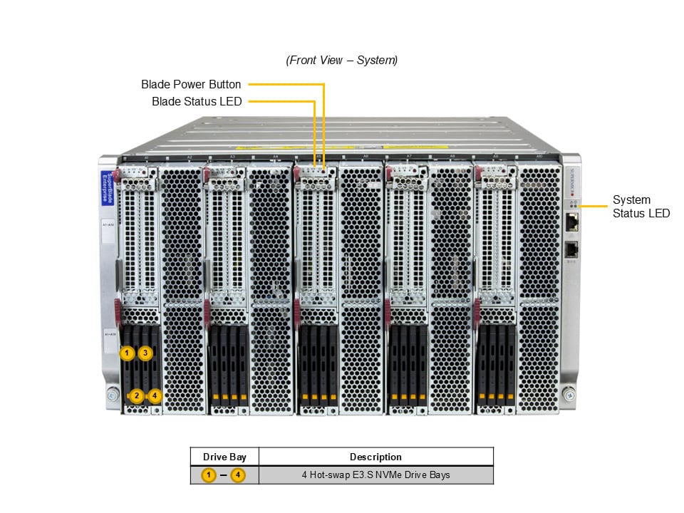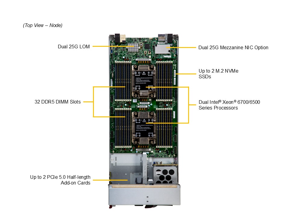 1. 35 serveurs par rack 42U2. Double socket E2 (LGA-4710), processeurs Intel® Xeon® 6700/6500 avec cœurs E ou cœurs P jusqu'à 350 W TDP3. Jusqu'à 1 To de MRDIMM avec des vitesses allant jusqu'à 8000 MT/s (1DPC) ou 8 To de RDIMM(3DS) avec des vitesses allant jusqu'à 6400 MT/s (1DPC) ou 5200 MT/s (2DPC) dans 32 emplacements DIMM4. 6 SSD NVMe avec 4 SSD E3.S hot swap (PCIe Gen5) et 2 M.2 (PCIe Gen5)5. Ethernet 25G à deux ports (Lan sur la carte mère) avec Intel® E8106. Emplacement d'extension pour une carte mezzanine Ethernet 25G à double port7. IO avant supportant 2 emplacements PCIe 5.0 FHHL pour une expansion flexible8. Une solution de refroidissement direct par liquide est disponible** Veuillez contacter votre représentant commercial Supermicro pour plus d'informations.