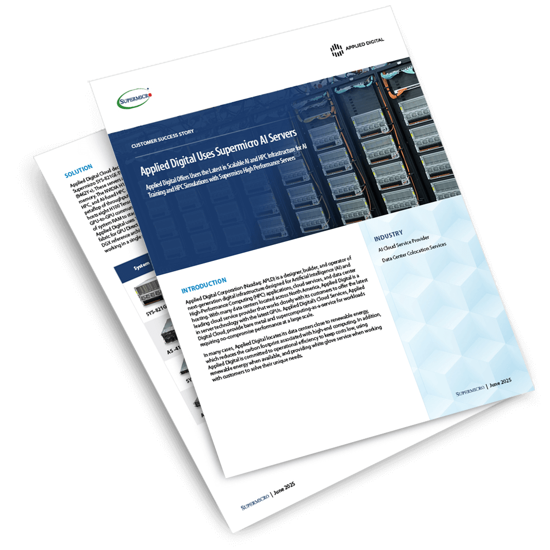 Applied Digitalは、Supermicro高性能サーバーにより、AIトレーニングおよびHPCシミュレーション向けの最新のスケーラブルなAIおよびHPCインフラストラクチャをユーザーに提供します。
