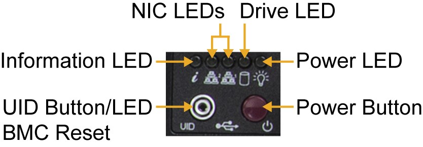 Steady on: power on Blinking at 4 Hz: checking BIOS/BMC integrity Blinking at 4 Hz and "i" LED is blue: BIOS firmware updating Two blinks at 4 Hz, one pause 2 Hz, and "i" LED blue: BMC firmware updating Blinking at 1 Hz and "i" LED red: fault detected |