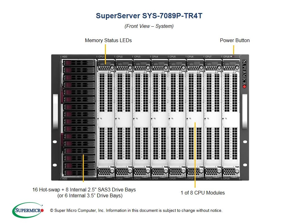 僅限完整系統:為確保品質與完整性,本產品僅以完整組裝系統形式銷售 (建議配置為 8 顆 CPU 搭配 96/48 個 DIMM,以實現最佳效能。) 如需特殊 4 顆 CPU 搭配 48/24 個 DIMM 的需求,請洽詢您的 Supermicro 業務代表,可能需支付額外費用。