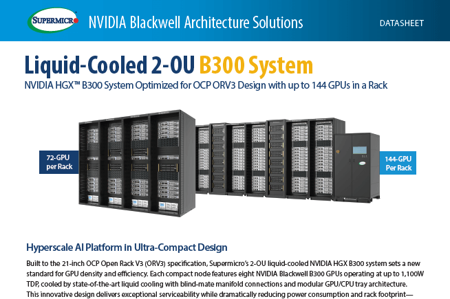 Supermicro Hyperscale AI Platform in Ultra-Compact Design: NVIDIA HGX™ B300 System Optimized for OCP ORV3 Design with up to 144 GPUs in a Rack